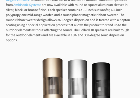 Residential Systems Magazine: Origin Acoustics has announced that the new Bollard 10 outdoor landscape speakers from Ambisonic Systems are now available with round or square aluminum sleeves in silver, black, or bronze finish.